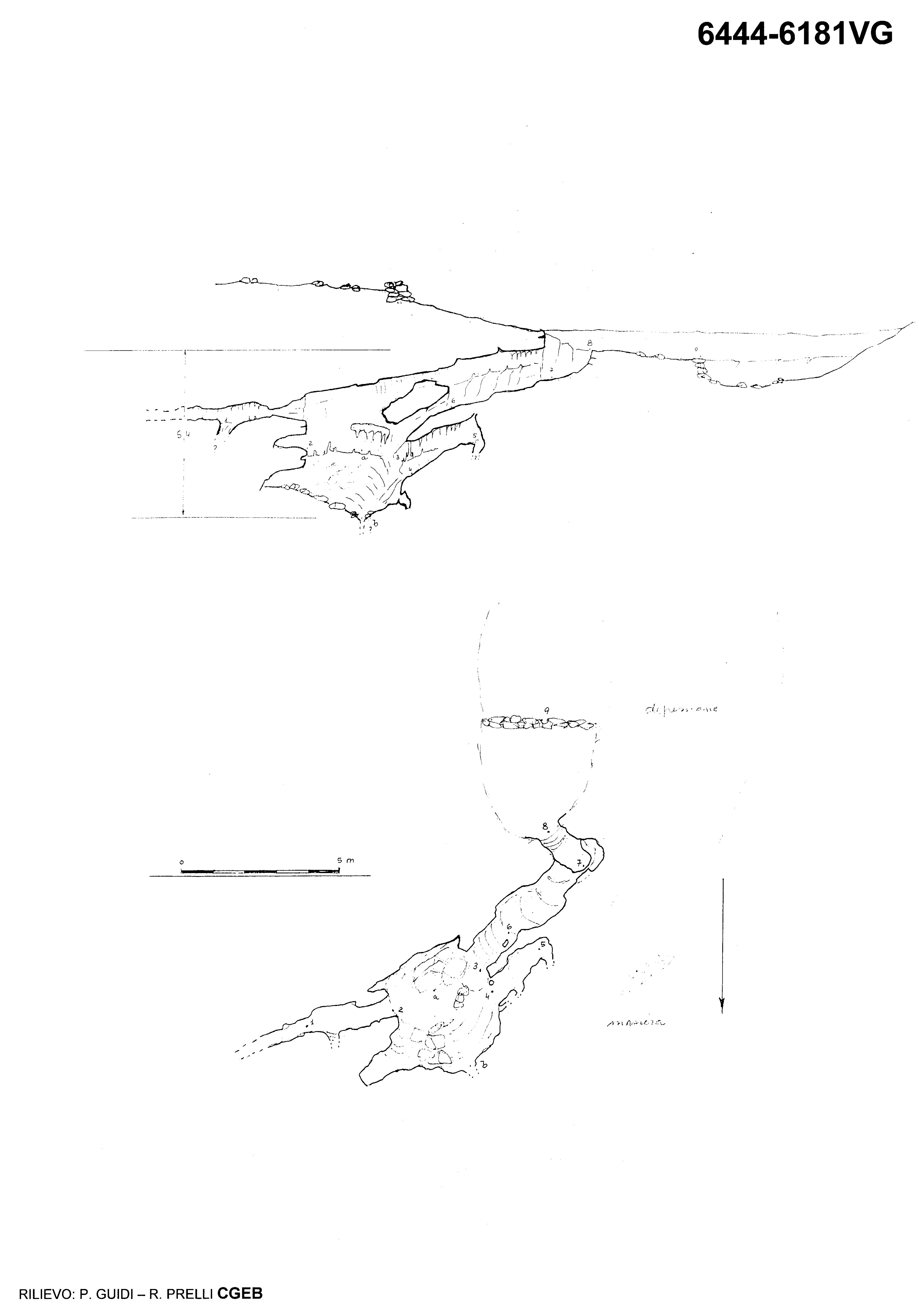 Una breve trincea aperta, con direzione SE-NW conduce ad una bassa galleria (p.ti 7-6 del rilievo), che si addentra in direzione NE; il suo fianco destro è costituito da una colata calcitica, il suolo è terroso ed in leggera pendenza verso l'interno. Alla fine dalla gallerietta, uno scivolo inclinato e non molto alto (p.ti 6-3), conduce in una stanzetta concrezionata (p.ti 3-2), nella quale, scendendo in direzione NNW tra massi, si giunge alla massima profondità, dove uno stretto passaggio terroso mette fine alla parte visitabile (p.to "b"). Tornando alla saletta concrezionata, in direzione NE, la cavità prosegue con uno stretto cunicolo, percorso per un paio di metri, sino ad un ulteriore restringimento, oltre il quale continua ancora per due - tre metri. Non si sono notati significativi movimenti d'aria.