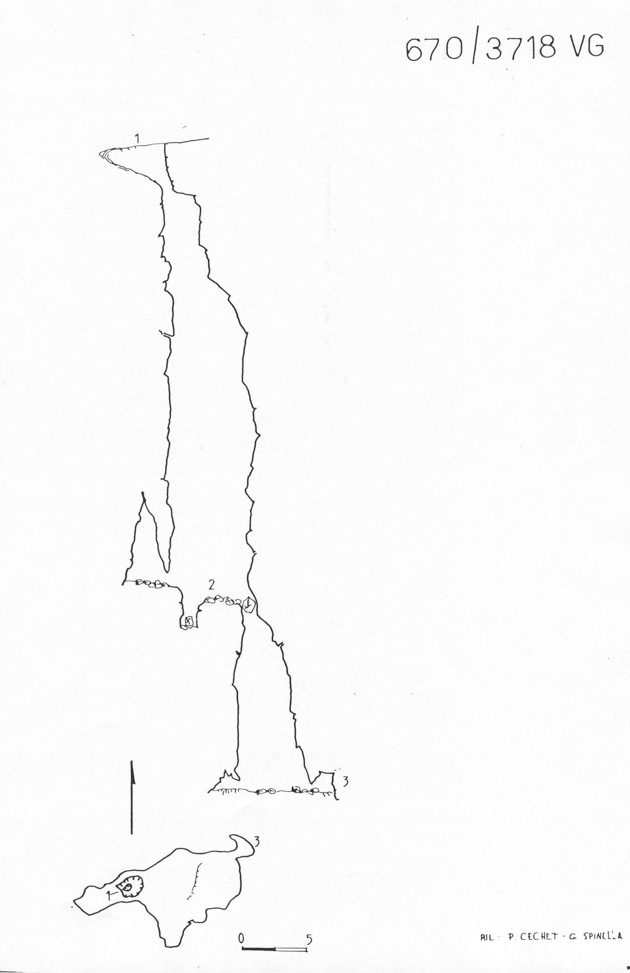L'ingresso della cavità si apre alla base di una parete rocciosa di una piccola dolina. Il primo pozzo scende per 34m e le sue pareti sono fortemente erose accidentate. Alla base di questo pozzo, oltre ad un trascurabile salto di 2m, si apre un pozzo di 15m che porta al termine della cavità, in una caverna dal suolo costituito da materiale clastico.