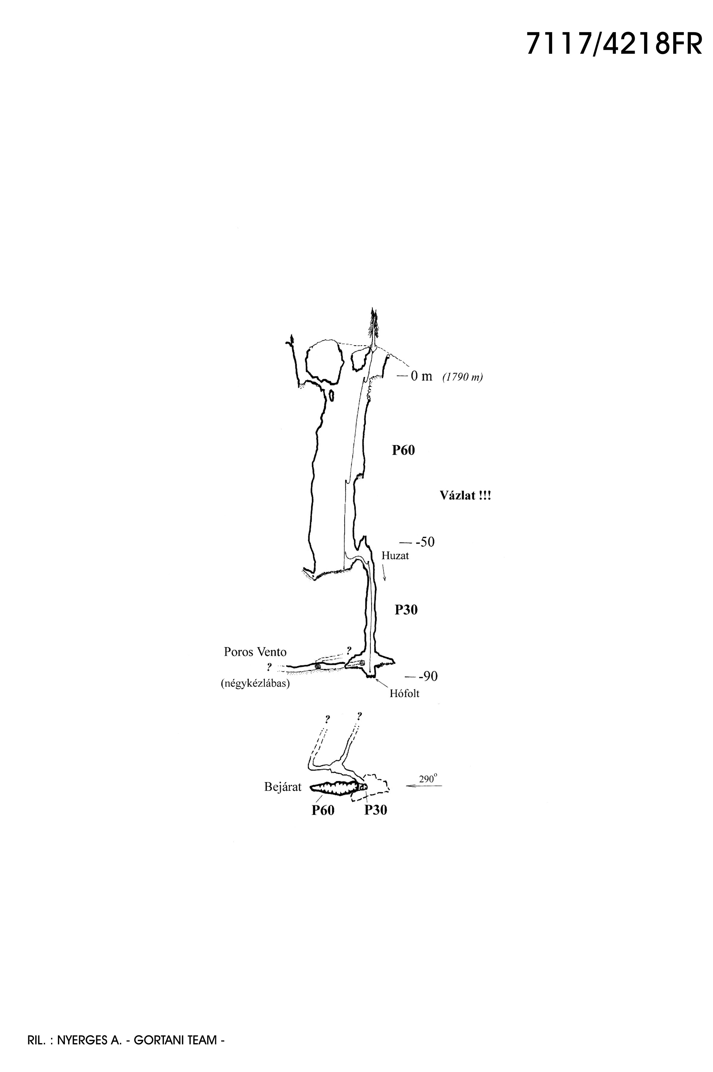 L'entrata nascosta da pini nani si trova in vicinanza dalla Grotta T11 (2969/1460FR), con cui non si collega e si sviluppa precisamente sopra la zona di Fás-kürt? dell'Abisso Michele Gortani (1487/585FR).